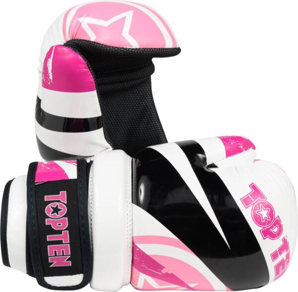 El “Urban Arts” Pointfighter de TOP TEN impresiona con una nueva ligereza. Su forma mantiene tus manos en la posición óptima de golpeo, pero son más flexibles que los guantes de boxeo clásicos gracias a la zona interior abierta. Las solapas de inserción para los dedos y el pulgar aseguran un ajuste firme, mientras que el acolchado “Wrist-Control” proporciona mayor estabilidad.